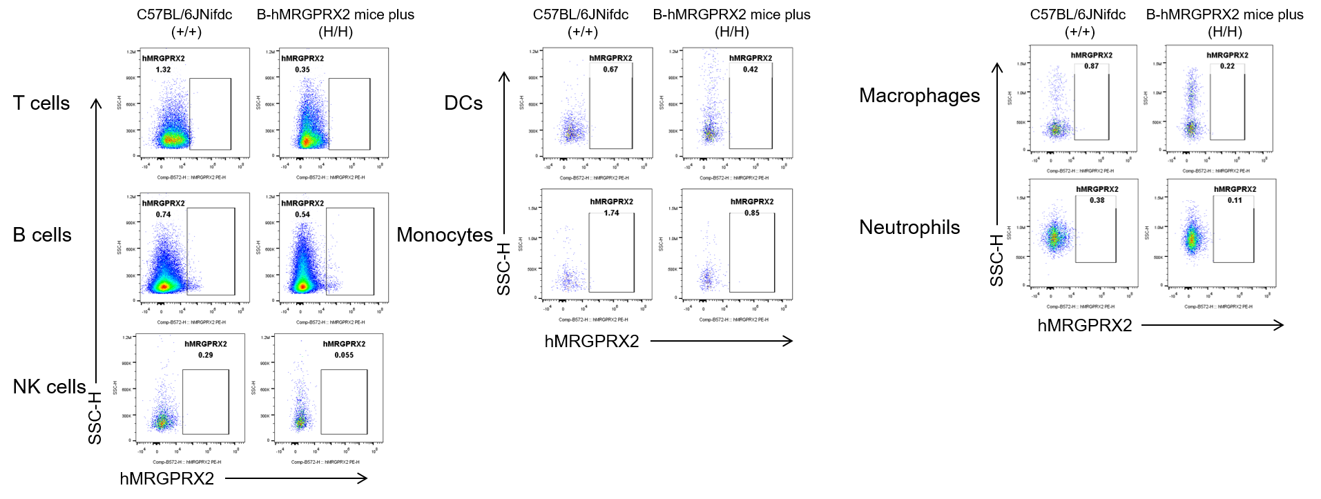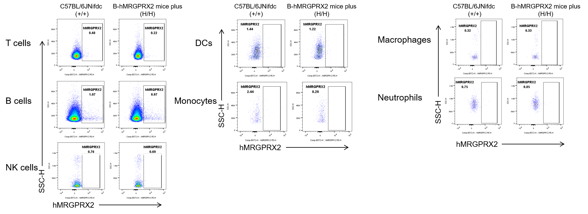 MRGPRX2 expression analysis in homozygous B-hMRGPRX2 mice plus by flow cytometry. Blood cells were collected from wild-type C57BL/6JNifdc mice (+/+) and homozygous B-hMRGPRX2 mice plus (H/H), and analyzed by flow cytometry with anti-human MRGPRX2 antibody(BioLegend, 359004). Human MRGPRX2 was not detectable on T cells, B cells, NK cells, DCs, monocytes, macrophages and neutrophils of blood in C57BL/6JNifdc mice and homozygous B-hMRGPRX2 mice plus.